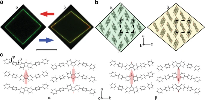 Crystal structure and morphology of the α-phase and β-phase 4-DBpFO. Credit: Nature Communications volume 10, Article number: 4573 (2019)Â