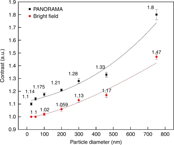 IR vs. nanoparticle diameter via PANORAMA (black squares) and by bright-field microscopy (red circles). Credit: Nature Communications volume 11, Article number: 5805 (2020)