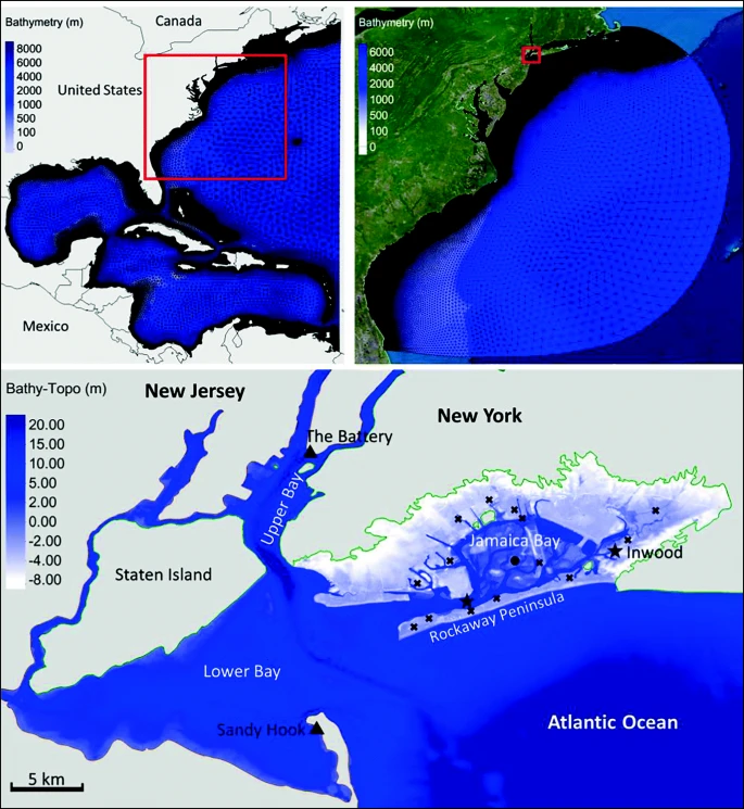 Basin-scale (top left) and high-resolution regional-scale (top right) meshes of ADCIRC model…. Credit: Climatic Change (2020)