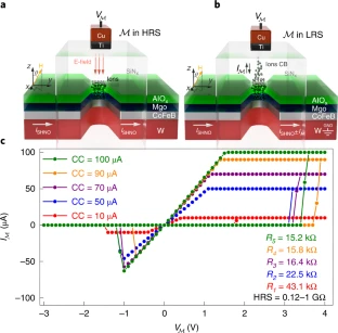 Device schematic and multi-level resistive switching of the memristor gate. Credit: Nature Materials (2021)Â