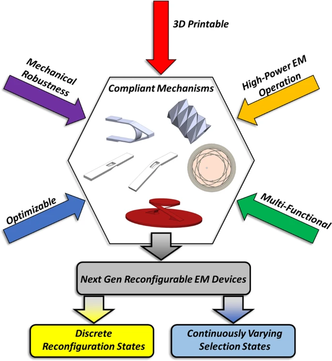 Overview of how the field of compliant mechanisms integrates into reconfigurable antenna and electromagnetic device technology. Credit: Nature Communication, 14, 683 (2023)